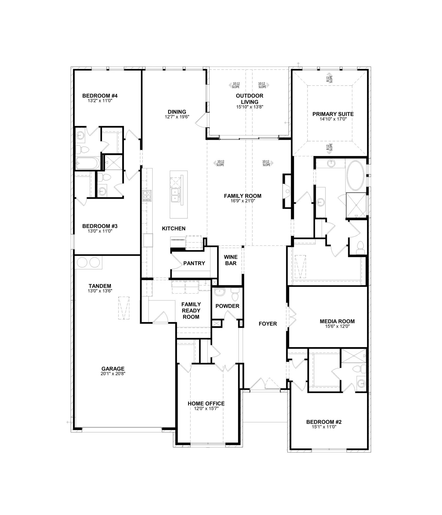 Lovely one-story plan with four bedrooms including the luxury primary suite, a private guest suite and two secondary bedrooms with full baths. The spacious family room includes a fireplace and overlooks the covered porch. Enjoy extra spaces that are both fun and functional with the media room, home office wine bar and family ready room. The 3D tour in this listing is for illustration purposes only. Options and finishes may differ in the actual home for sale. Any furnishings shown are not a part of the listing unless otherwise stated.